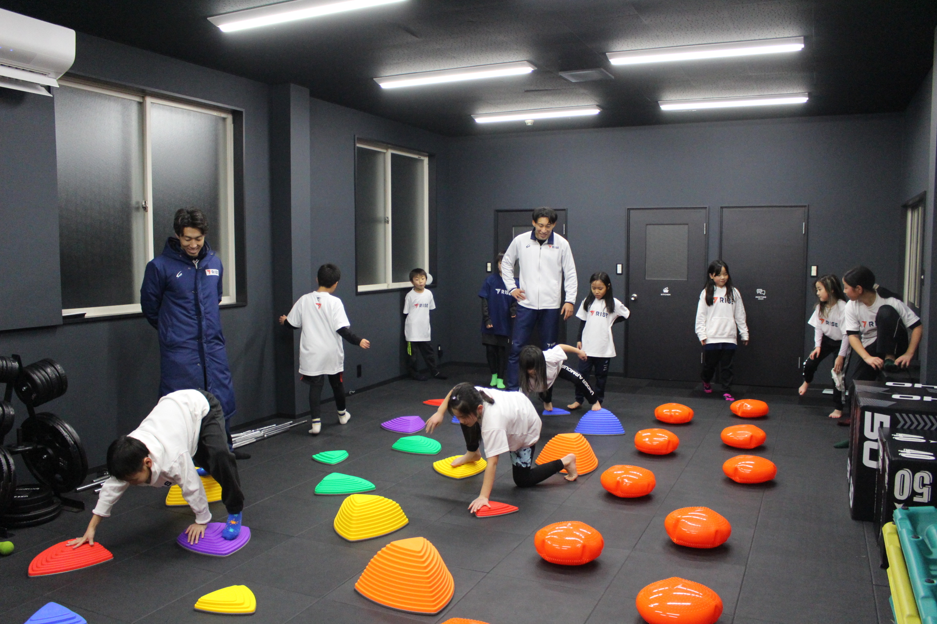 ※写真は小学1~3年生クラスで、バランスストーンとバランスディスクを使ったアニマルウォークでコーディネーション能力(運動神経)を高めるトレーニングの様子。